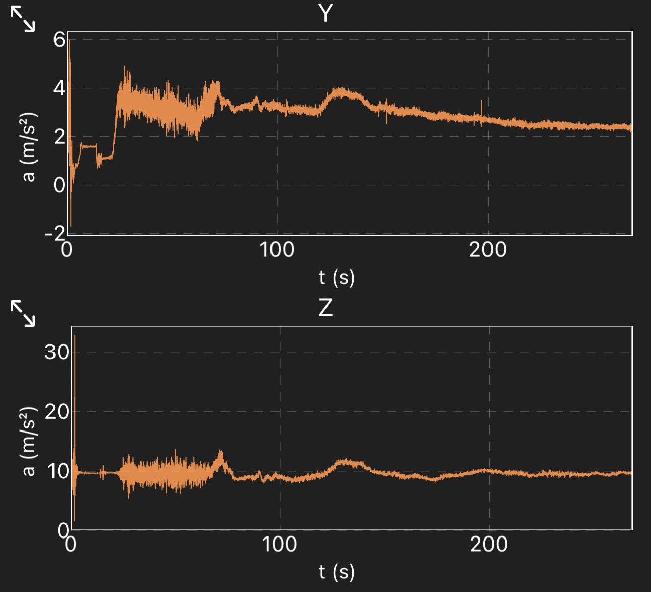 The second figure shows the corresponding accelerometer data along two axes during the same time interval. The acceleration trace reveals a clear increase during the takeoff roll. In the forward axis, the signal rises as thrust builds and the aircraft accelerates down the runway. The vertical axis shows fluctuations associated with vibration, runway irregularities, and eventually the transition to flight. Once airborne and in steady climb, the accelerations settle into a more stable profile dominated primarily by gravitational acceleration and small perturbations from turbulence.