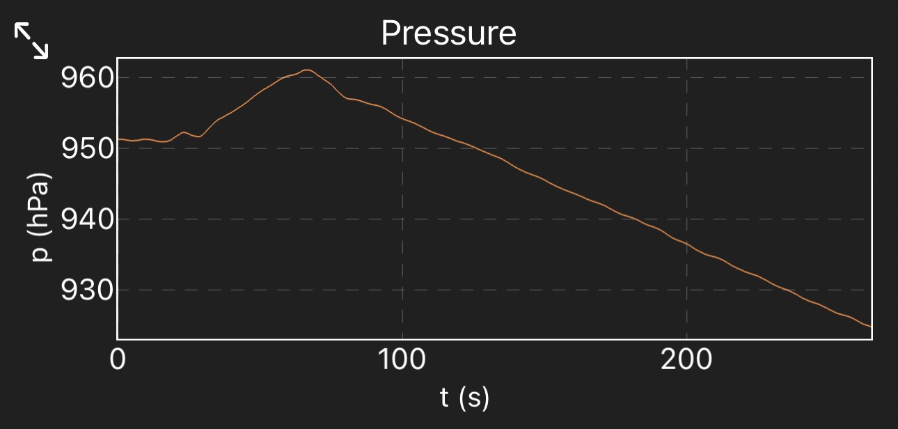 When the pressure and acceleration data are considered together, a clear correlation emerges. The local rise in pressure occurs during the same time window as the strongest forward acceleration. This supports the interpretation that the initial pressure variation is driven by inertial redistribution of air within the cabin. After acceleration stabilizes and climb begins, the dominant effect on the barometer is no longer inertia but altitude gain, leading to the gradual pressure decrease seen in the remainder of the trace.