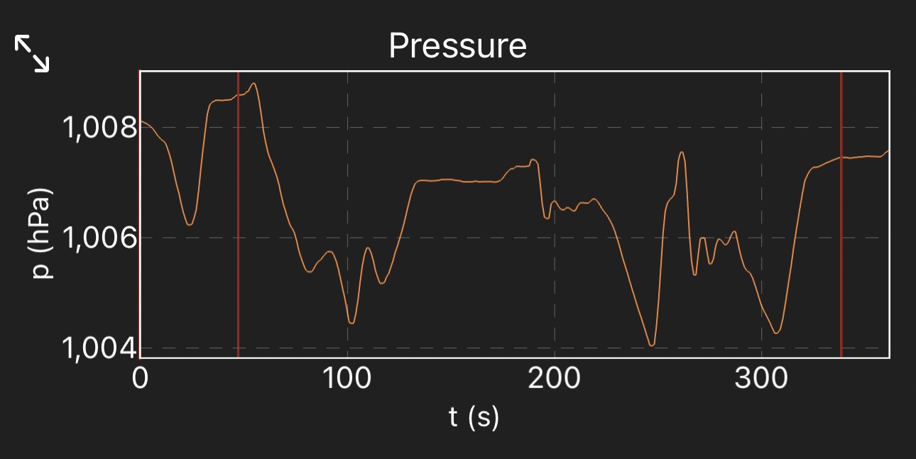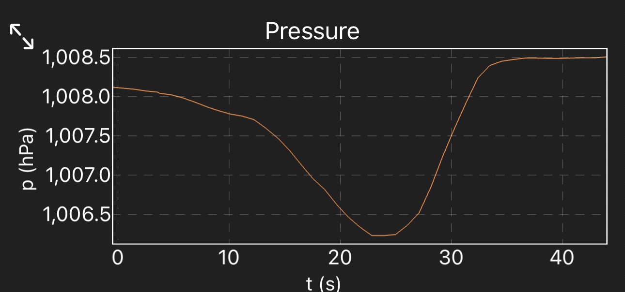 The barometer, which is what we will be using, measures ambient air pressure with surprising sensitivity. I opened the barometer tool in the app and monitored pressure readings while standing in the first cabin. Over several stops, I observed a gradual pressure increase as the train decelerated approaching a station and a decrease in pressure as the train accelerated away. The plot shows the barometric pressure recorded over approximately 45 seconds, corresponding to a single approach–stop–departure cycle. At the beginning of the trace, the pressure is relatively stable at around 1008 hPa. As the train begins accelerating, the pressure gradually decreases, reaching a minimum of approximately 1006 hPa around 22–24 seconds. Once the train approaches a stop and begins decelerating, the pressure starts to increase.